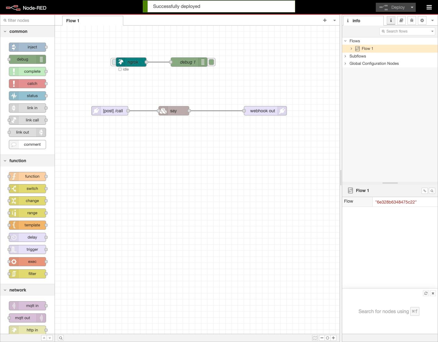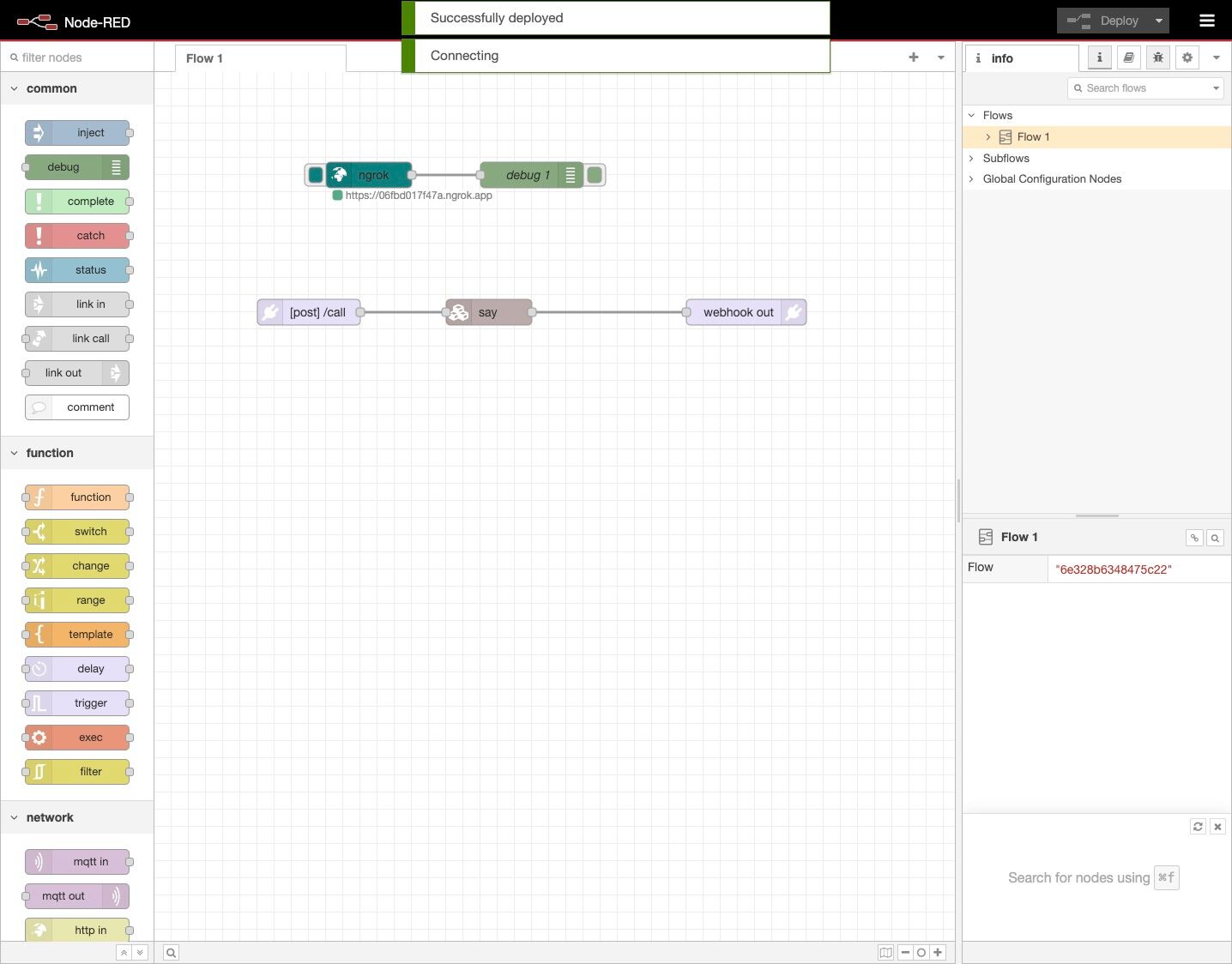 23. Drag a debug node from the palette to the canvas and wire it to the ngrok node.