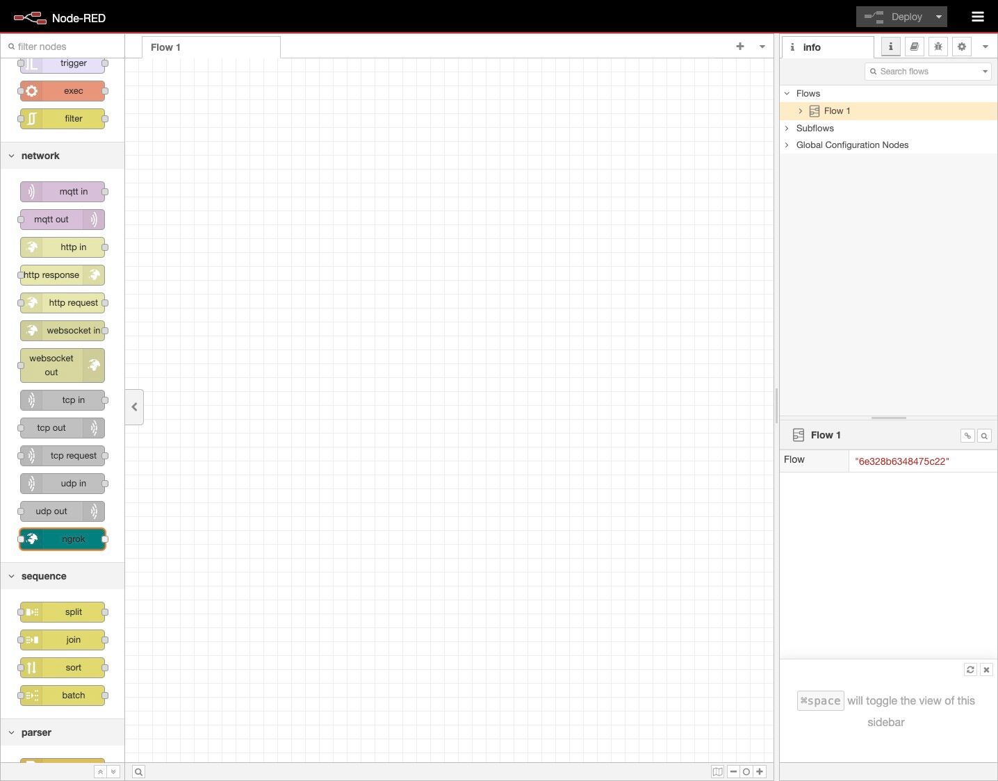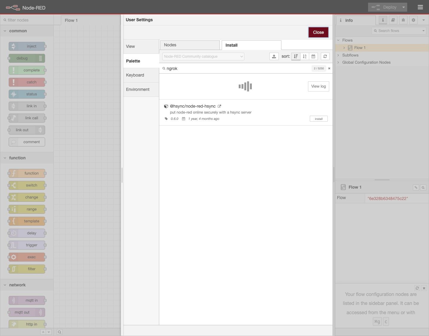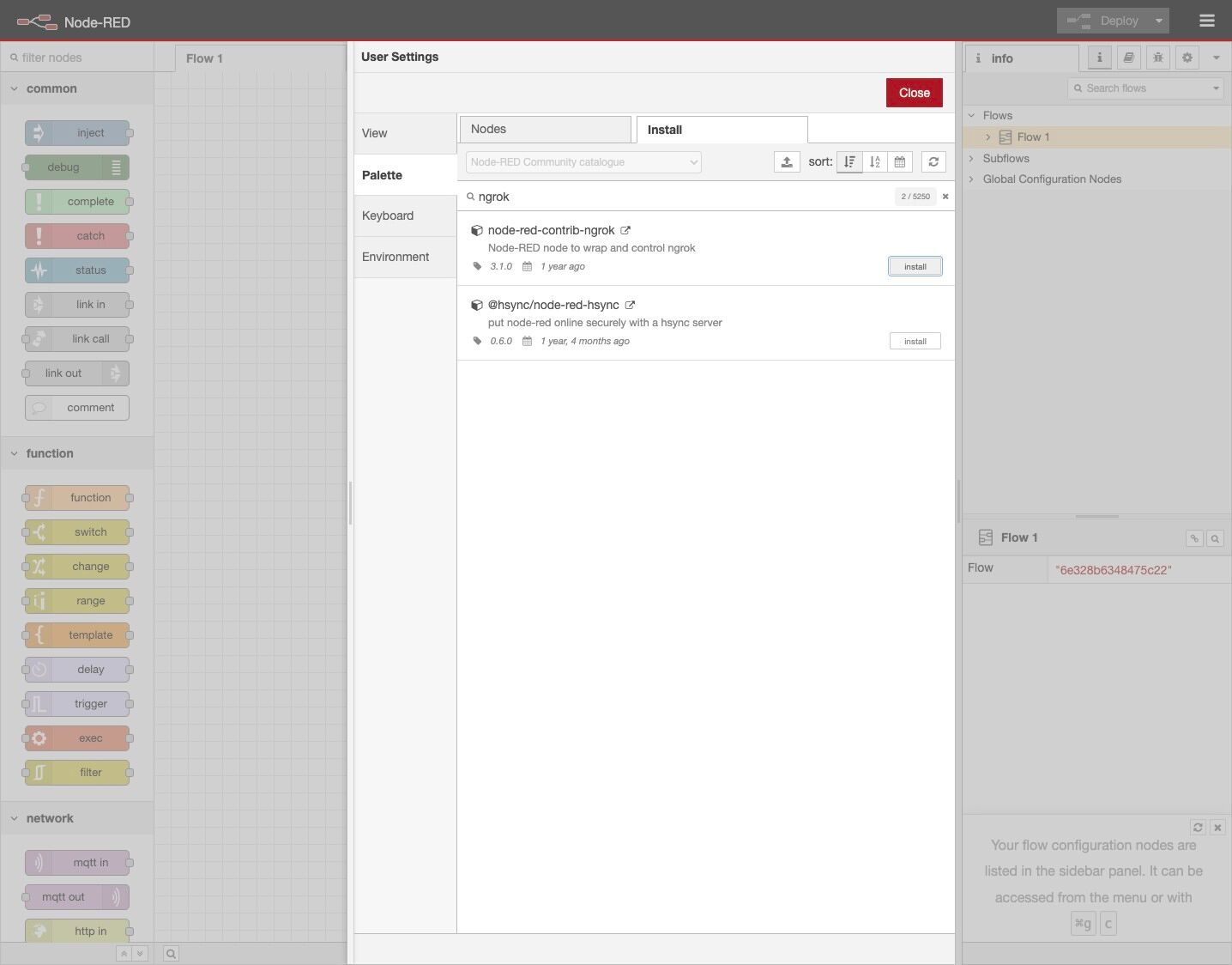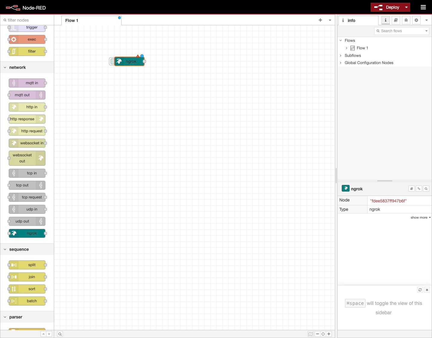 9. On the left-hand side is the palette, scroll down to find the ngrok node.