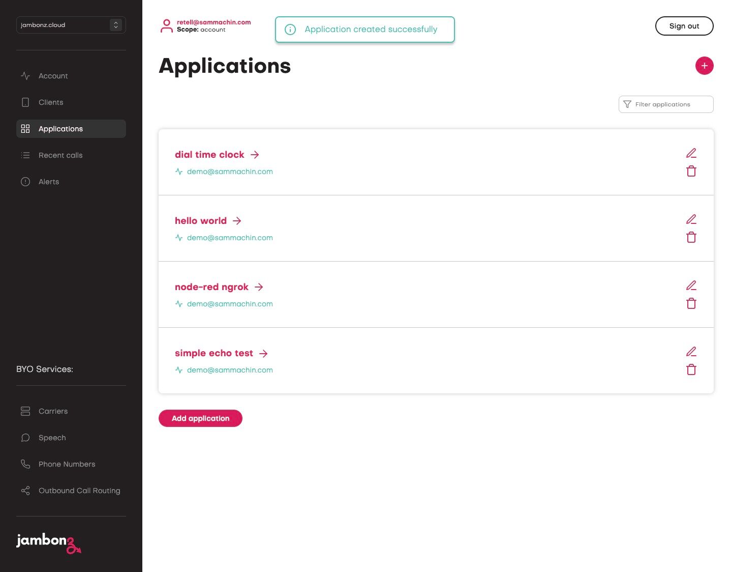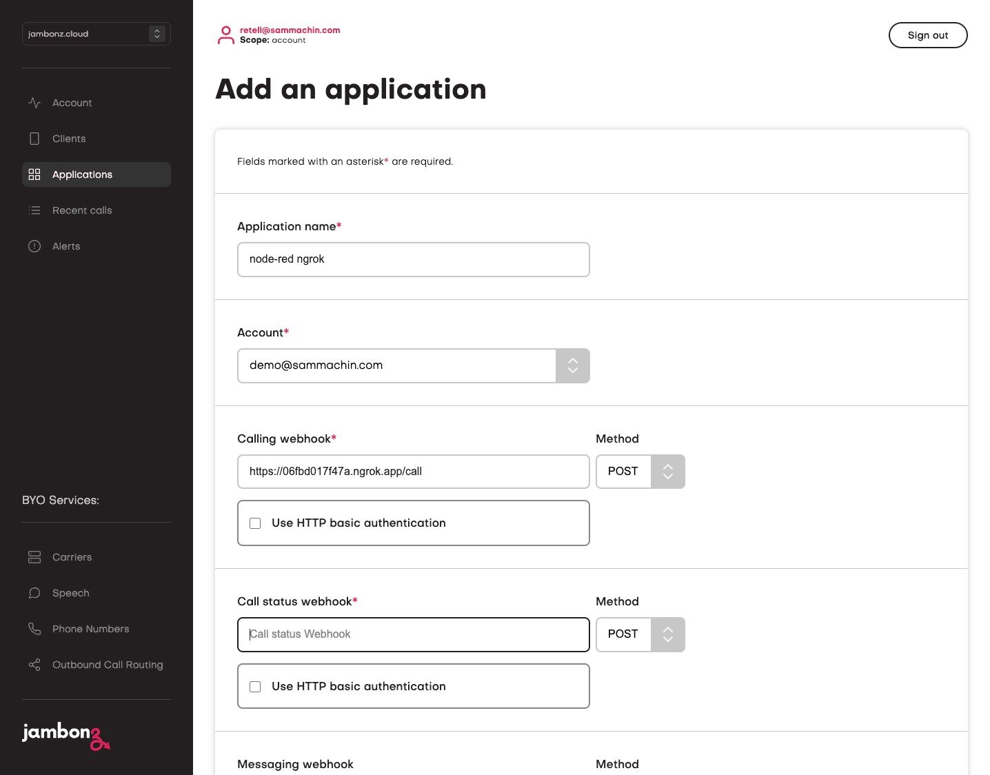 Now that our application is running, we need to configure jambonz to use it. This is done in the jambonz portal by creating a new application.