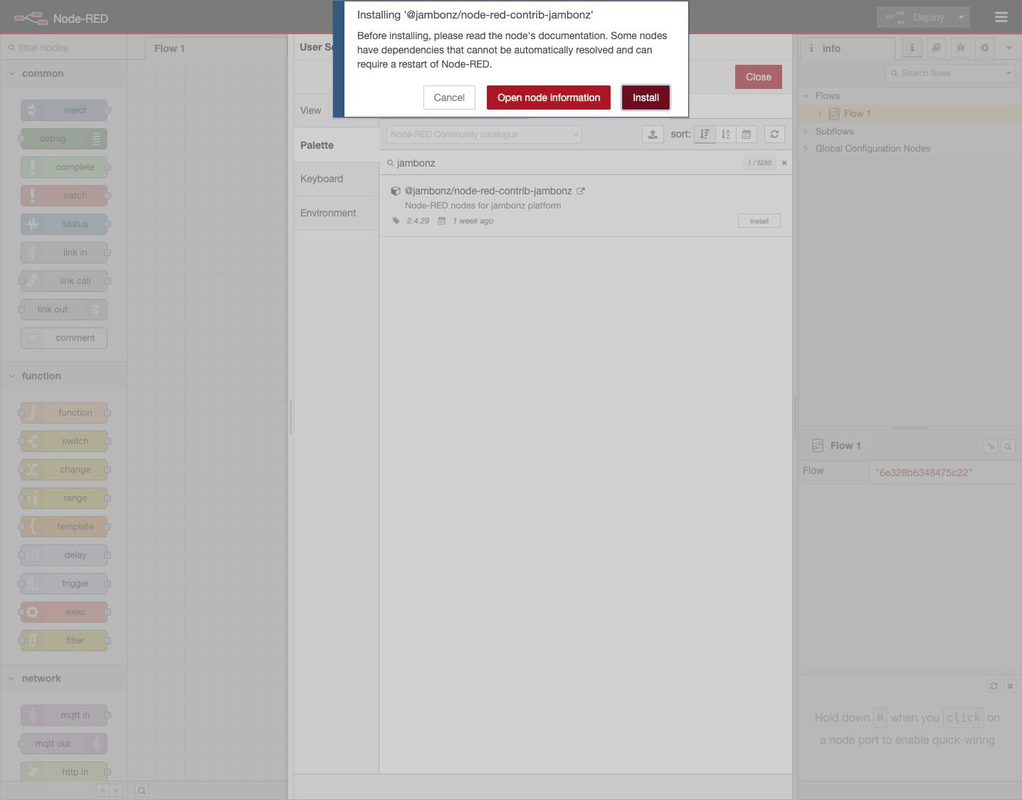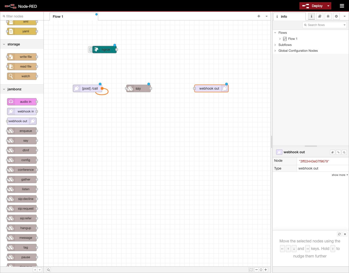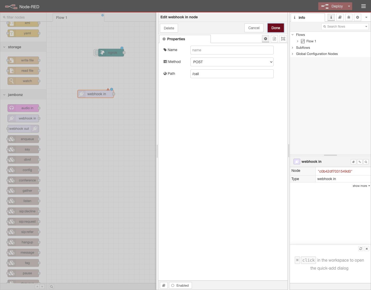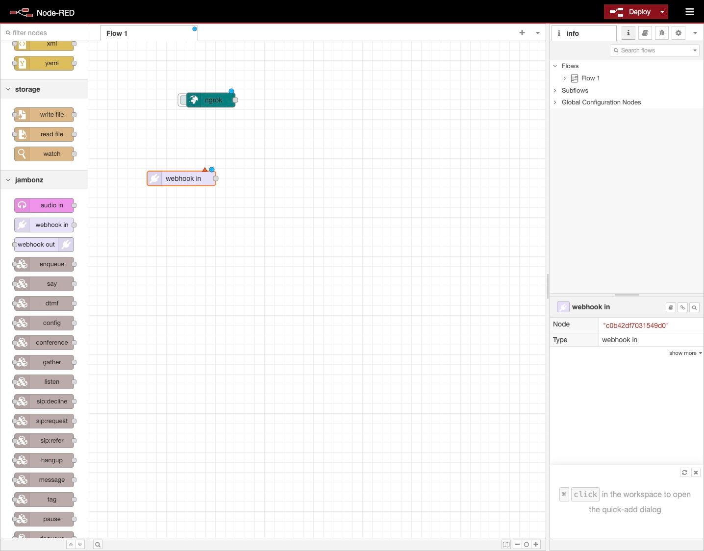 This guide shows you how to install the jambonz package for Node-RED and set up ngrok to allow jambonz to send webhooks to Node-RED running on your local machine. It assumes that you have already: