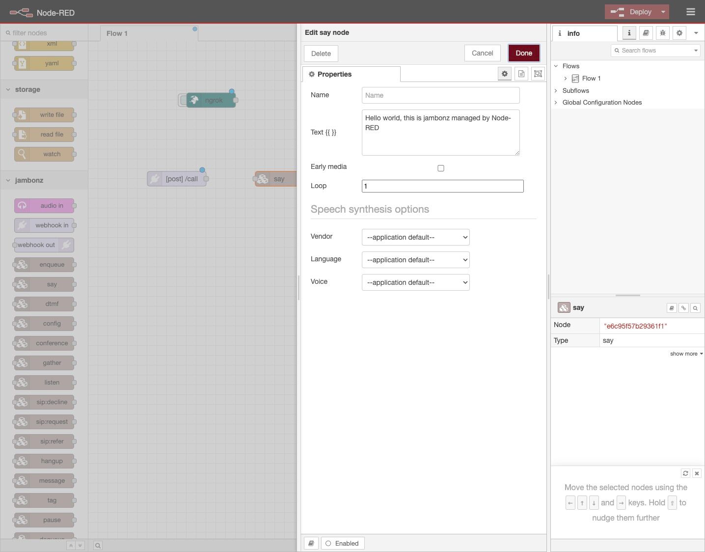19. Type “Hello world, this is jambonz managed by Node-RED”.