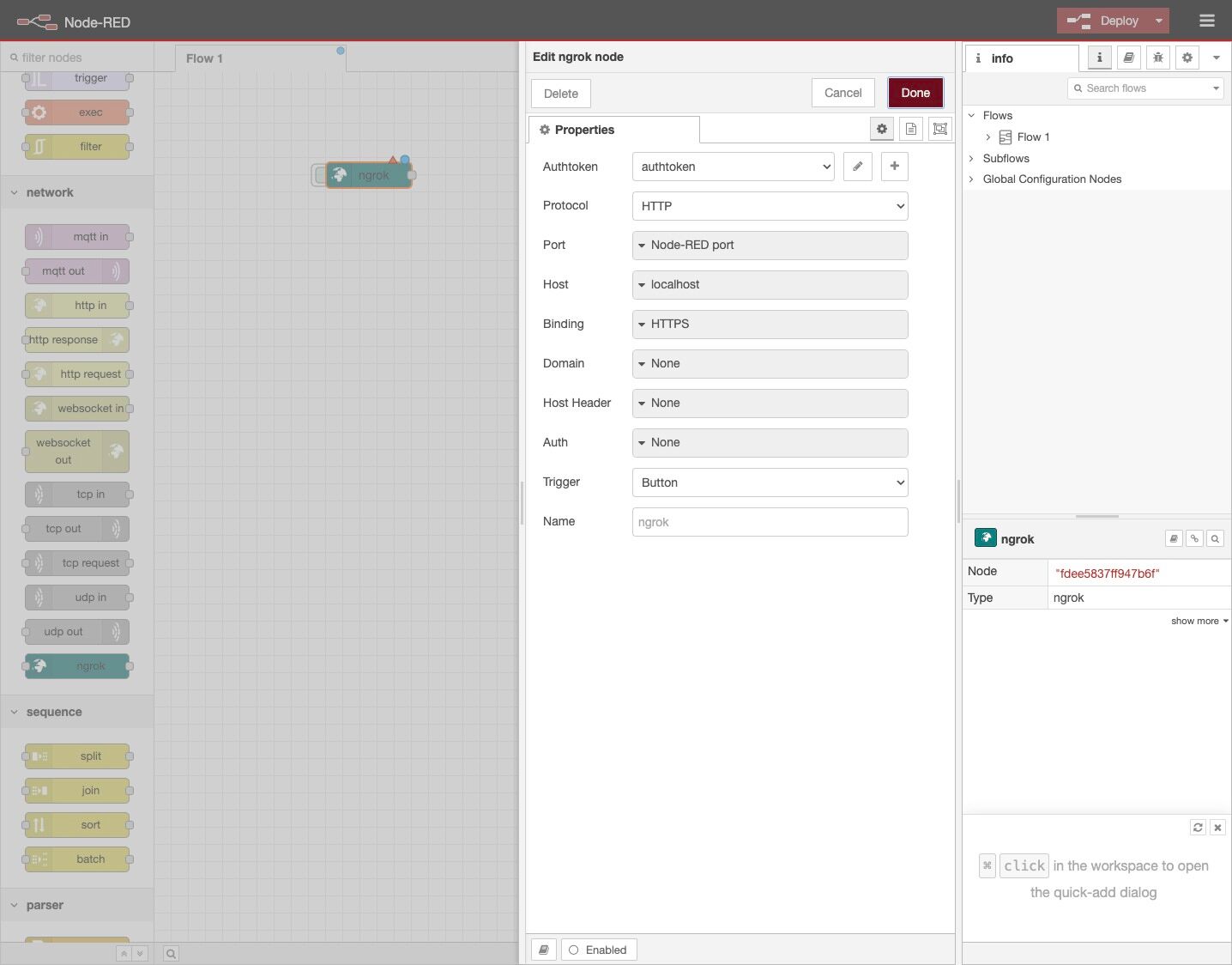 25. Click the button on the ngrok node to activate your ngrok tunnel.